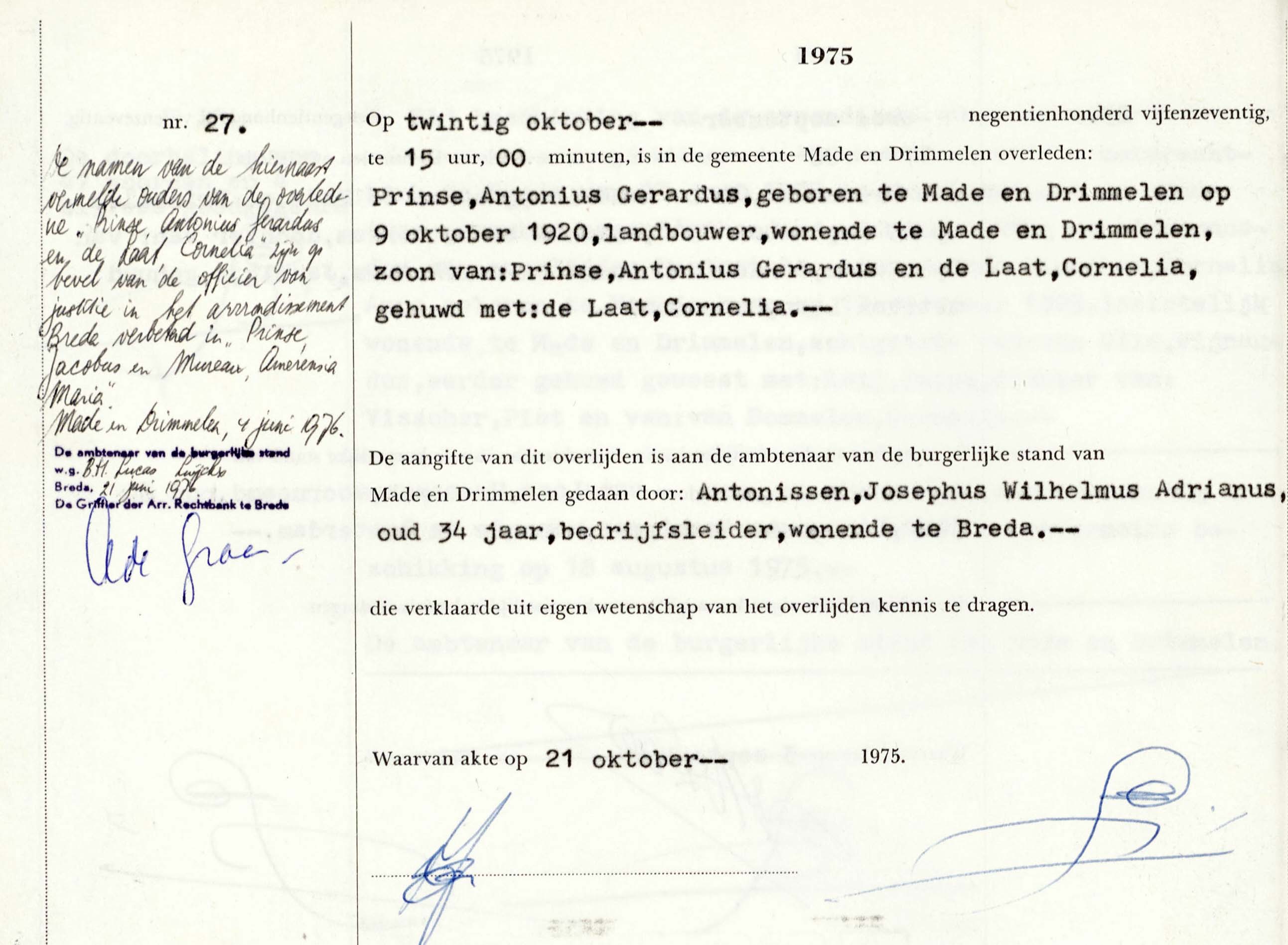 | Antonius Gerardus Prinse | 09-10-1920 Made | 20-10-1975 Made | Cornelia de Laat | |||