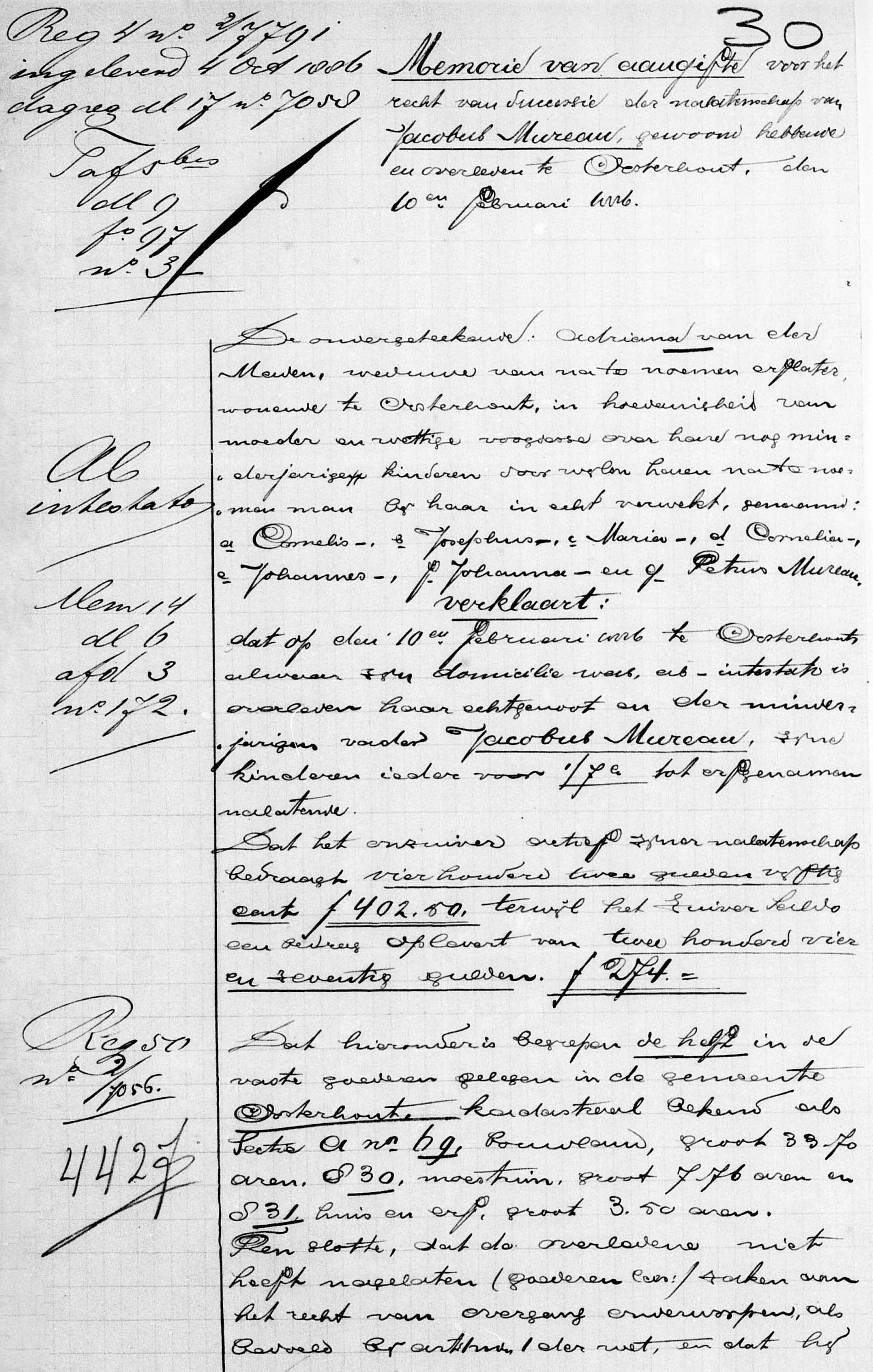 Memorie van aangifte voor het recht van successie der nalatenschap van Jacobus Mureau, gewoond hebbende en overleden te Oosterhout den 10 februari 1886