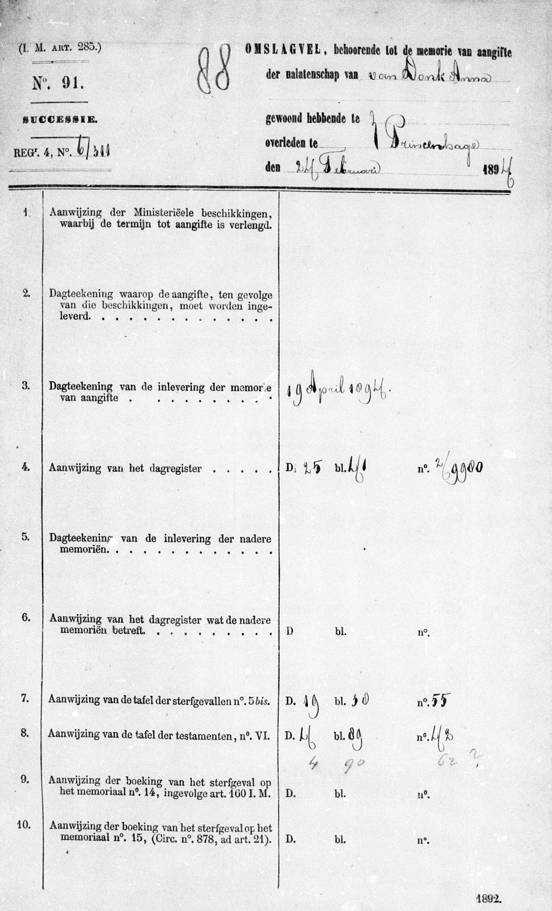 Memorie van aangifte voor het recht van successie der nalatenschap van Anna van Donk.