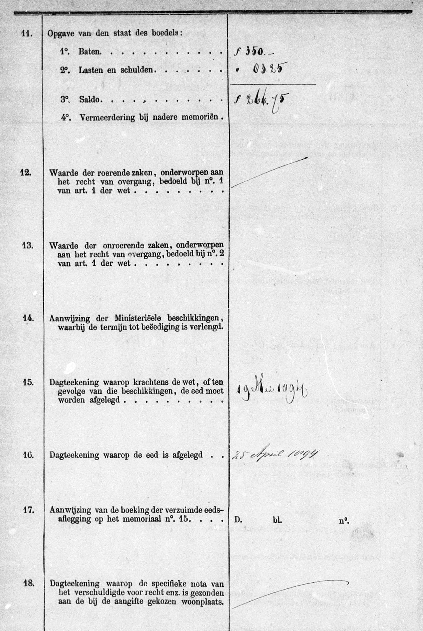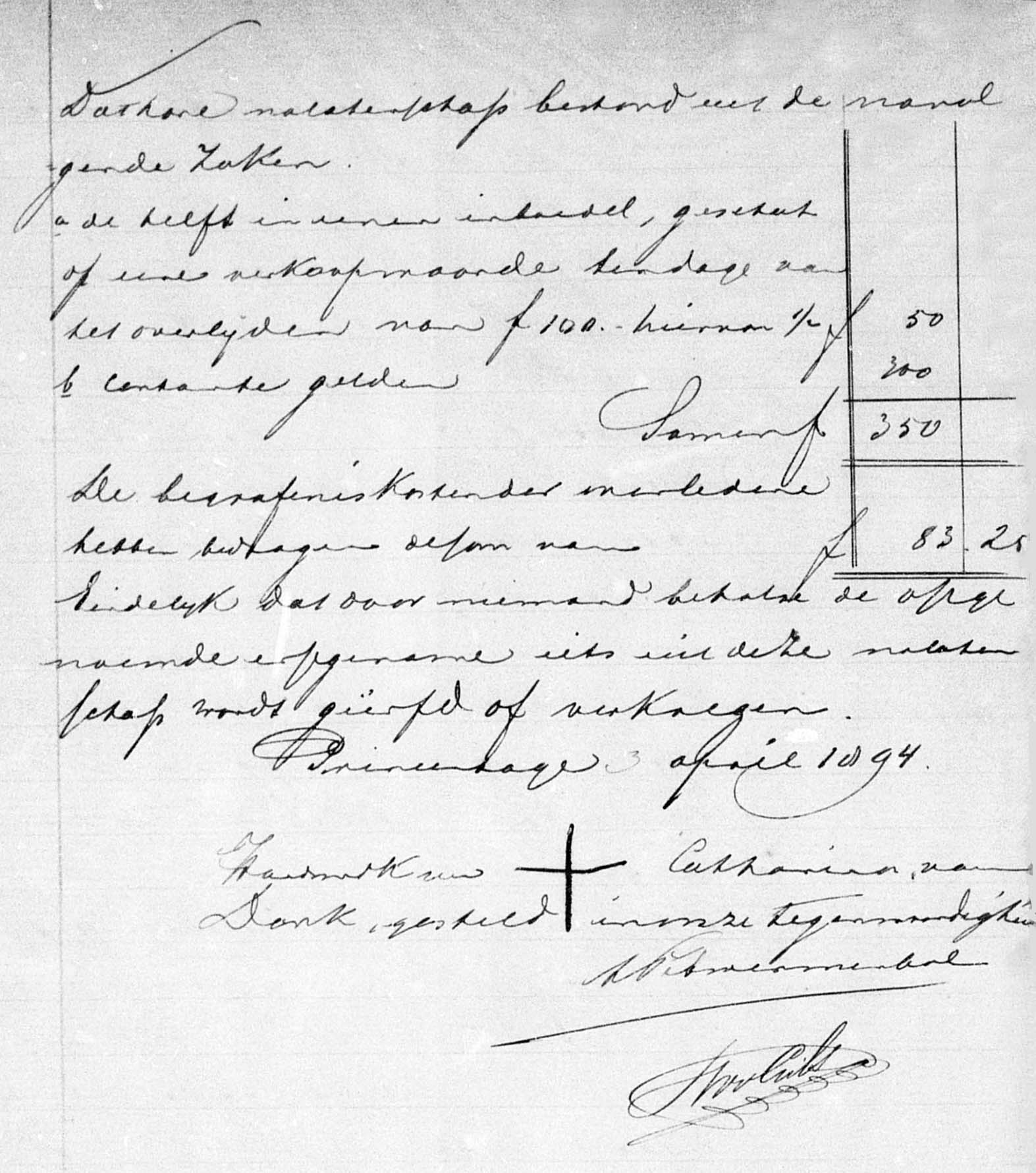 Er wordt nog wel even gemeld dat zonder testament ("bij versterf") alles over haar zus en de kinderen van haar andere zus en haar twee broers zou worden verdeeld. Maar dat is een formaliteit. Er is geen sprake meer van een hypotheekschuld of van grondbezit. De hypotheek is in 1884 afgelost en het huis en grond is in november 1883 verkocht. Begrafeniskosten zijn 83 gulden, dat is best ruim.