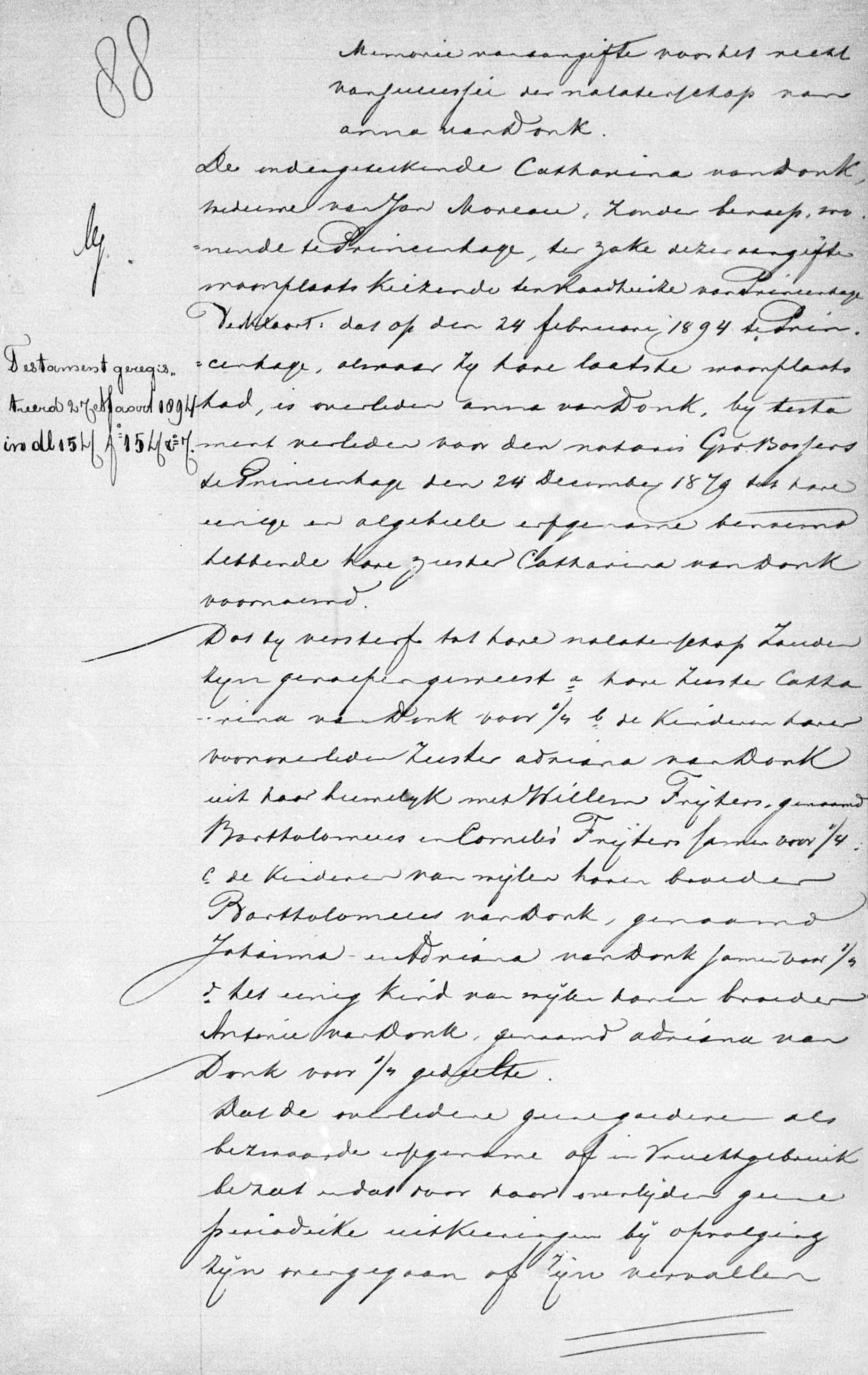 Verklaart: dat op den 24 februari 1894 te Princenhage, alwaar zij haar laatste woonplaats had, is overleden Anna van Donk, bij testament, verleden van den notaris G.W. Bossers te Princenhage den 24 december 1879, tot haare eenige en algeheele erfgename benoemd hebbende haar zuster: Catharina van Donk voornoemd.