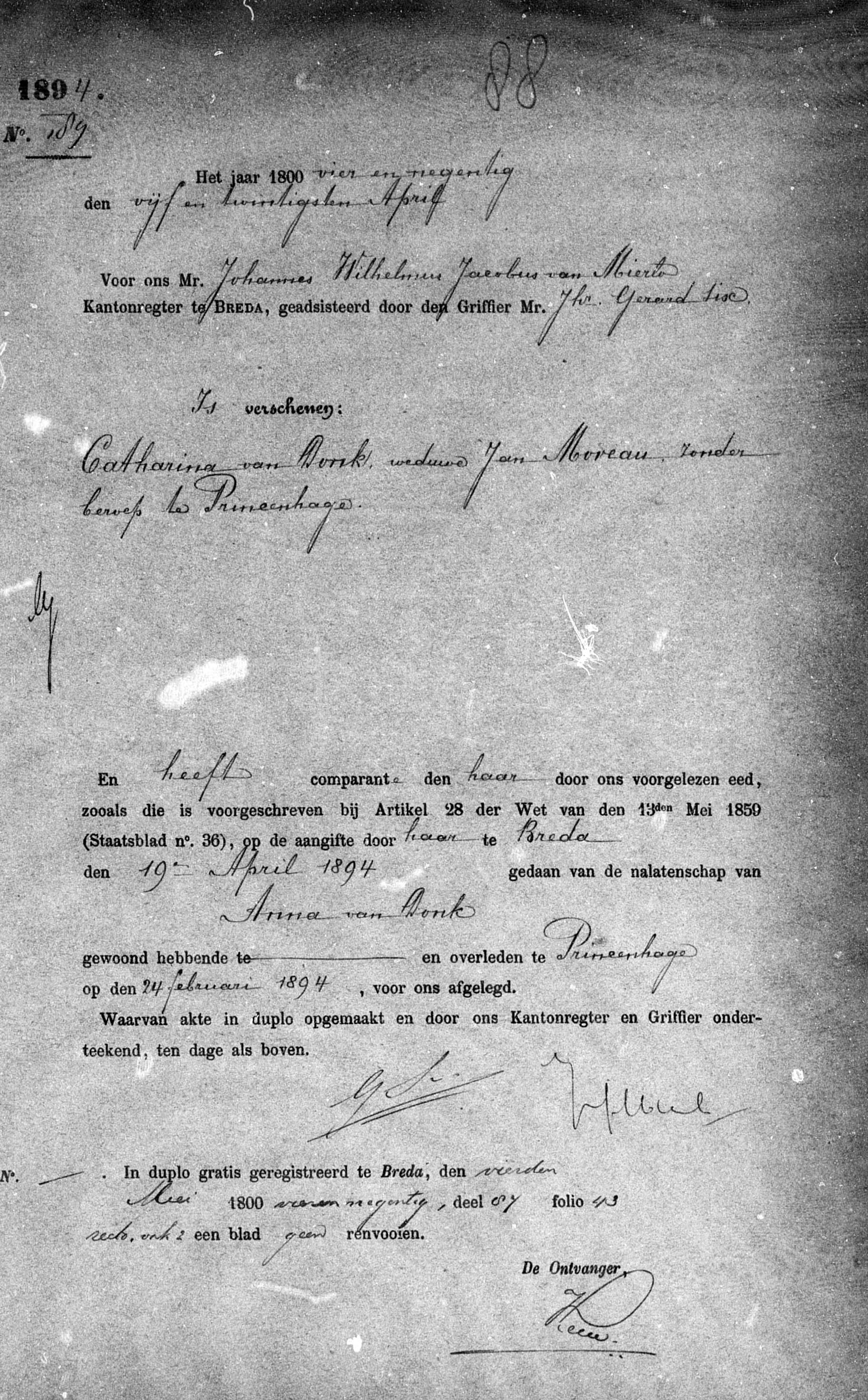 De ondergeteekenden: Catharina van Donk, weduwe van Jan Moreau, zonder beroep, wonende te Princenhage ter zake dezer aangifte woonplaats kiezende ten Raadhuize van Princenhage.