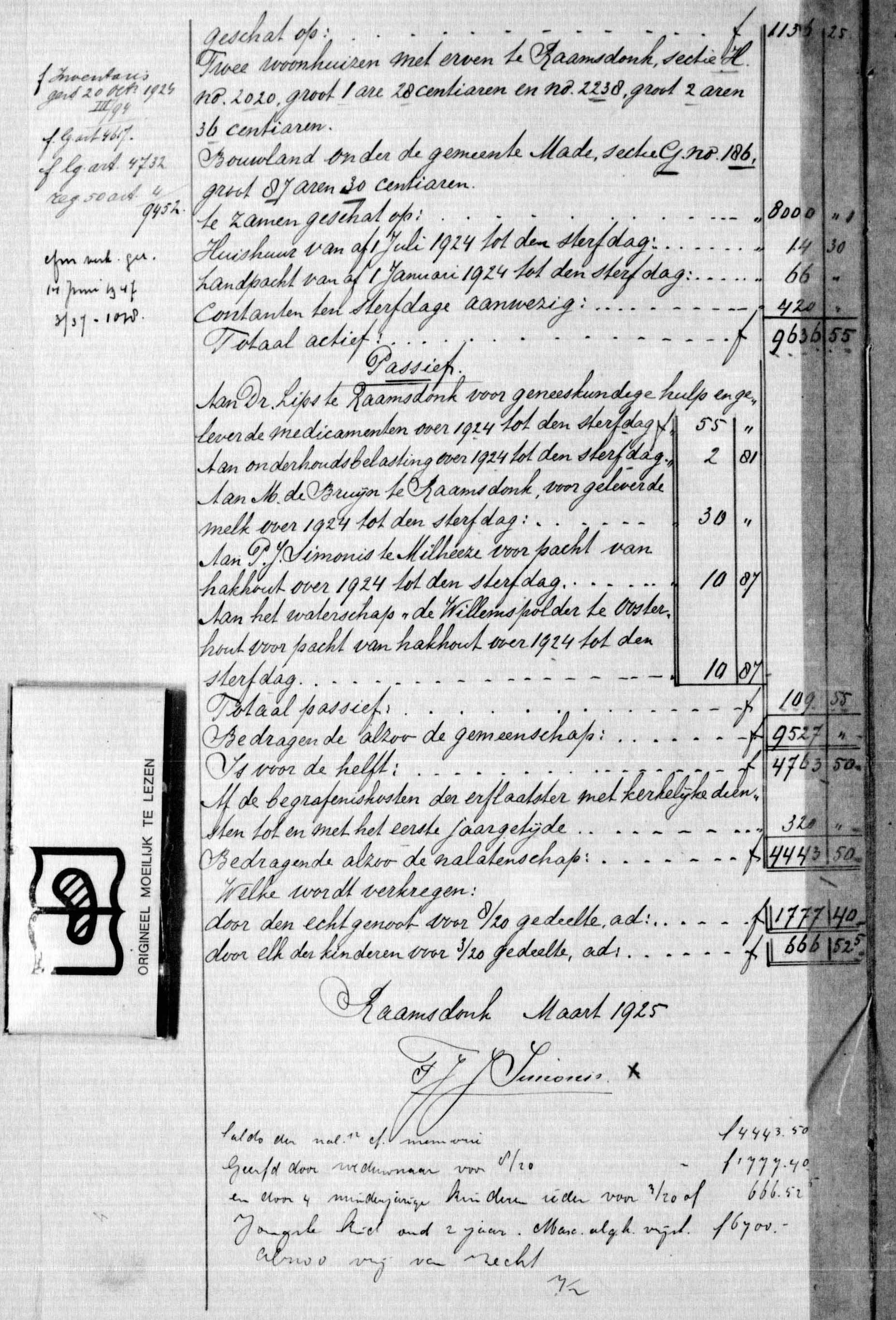 De nalatenschap bestaat vooral uit (twee) huizen en grond. Het totaal vermogen komt neer, na aftrek van schulden en andere kosten, op ongeveer 4400 gulden (in tegenwoordig geld ongeveer 100000 euro).